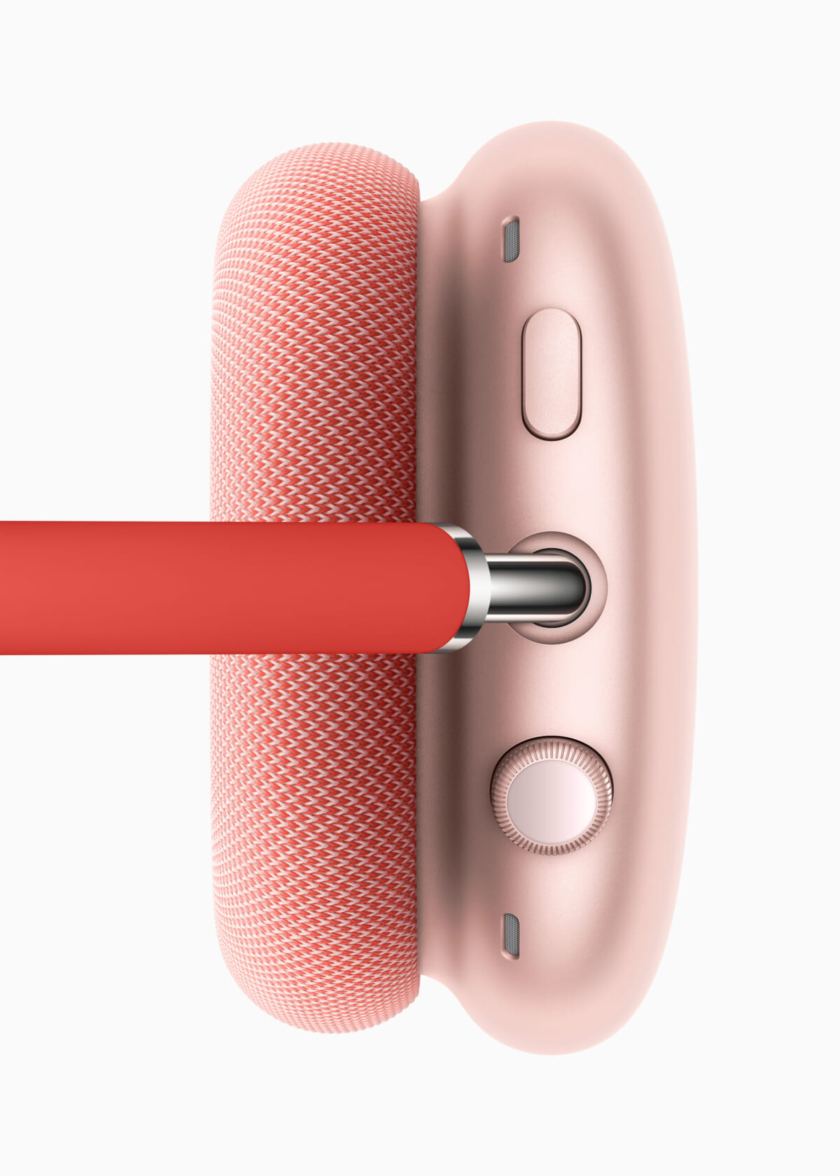 AirPods Maxはあらゆる部分が丹念に作り込まれ、どのユーザーにとっても格別な音響特性を発揮できる仕組みを採用したとのこと。ヘッドバンドのキャノビーは通気性のあるニットメッシュ素材で作られており、ヘッドホン全体の重さを分散して頭部にかかる圧力を減らします。ステンレススチール製フレームのヘッドバンドは耐久性と柔軟性にすぐれ、どんな形やサイズの頭にもなじむ設計です。また、伸縮するヘッドバンドのアームはスムーズに伸び、好みのフィット感を保てるとのこと。