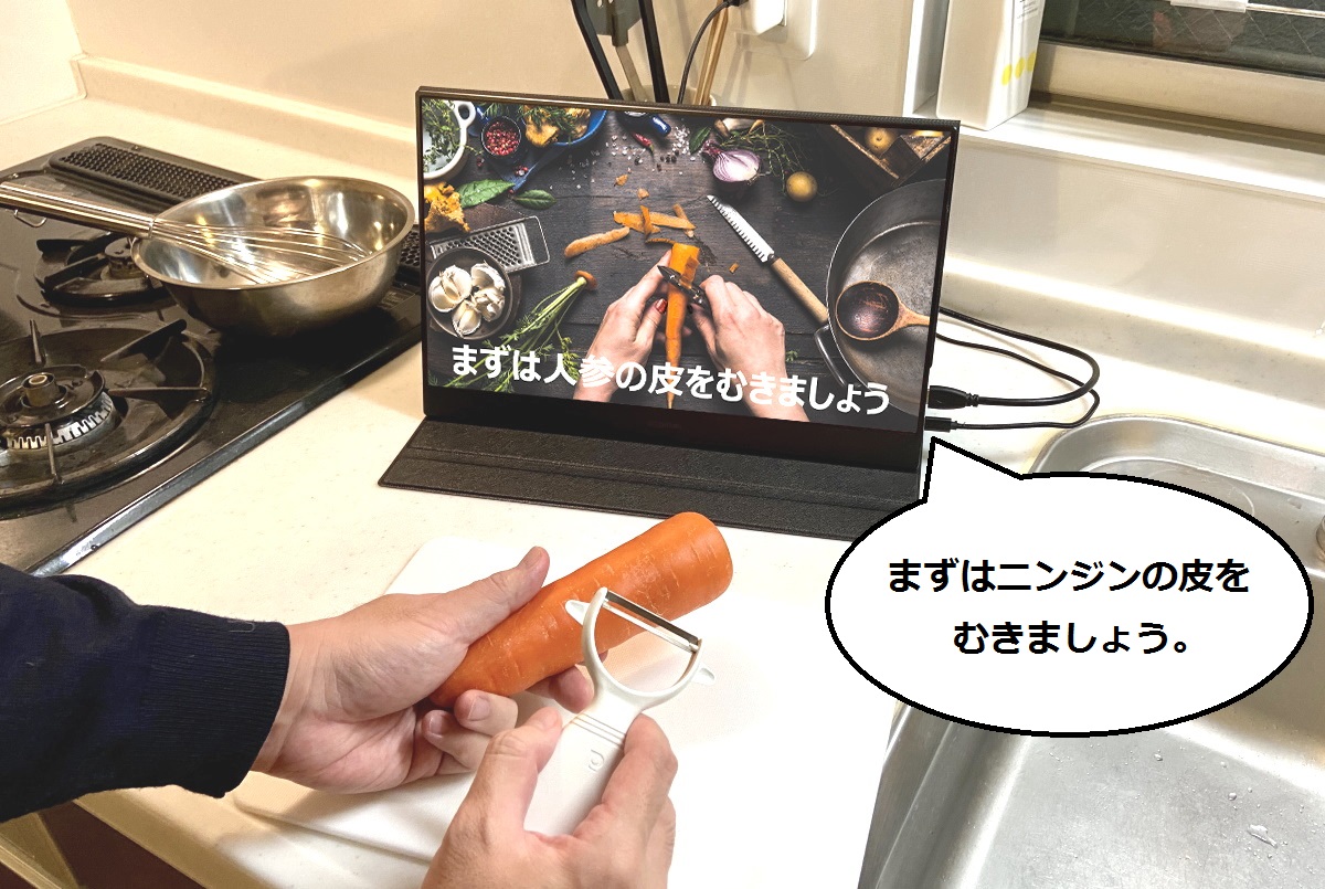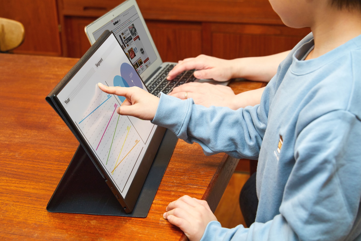 例えば、小さい子どもにタブレット端末などを渡して子ども向けのネット動画などを見させる場合、子どもがタブレットの画面を触ってしまうと、再生が止まってしまったり、別のアプリが誤って起動してしまうようなことがあります。しかし、こちらのポータブルモニターにスマホやPCから映像を出力させておけば、子どもが画面を触ってしまっても誤操作してしまうことがなく、安心して使用できます。