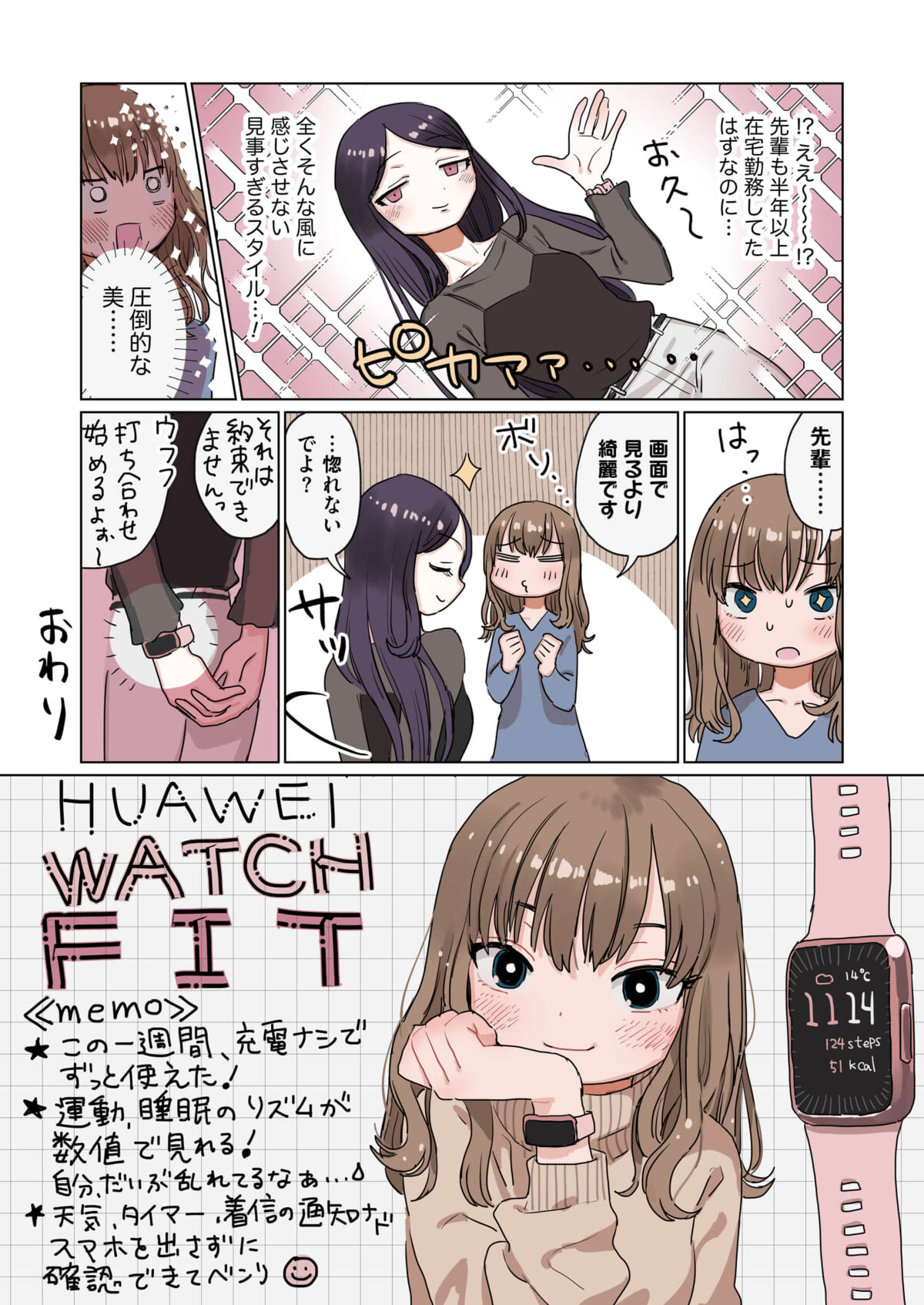 1.64インチの縦長ディスプレイと約34gの軽量ボディ、そして豊富なカラバリについてご紹介しました。マンガ内でも後輩ちゃんが通知があるまでその存在を意識することなく自然と着けていたように、HUAWEI WATCH FITは一日中着けてもストレスが少ない設計になっています。