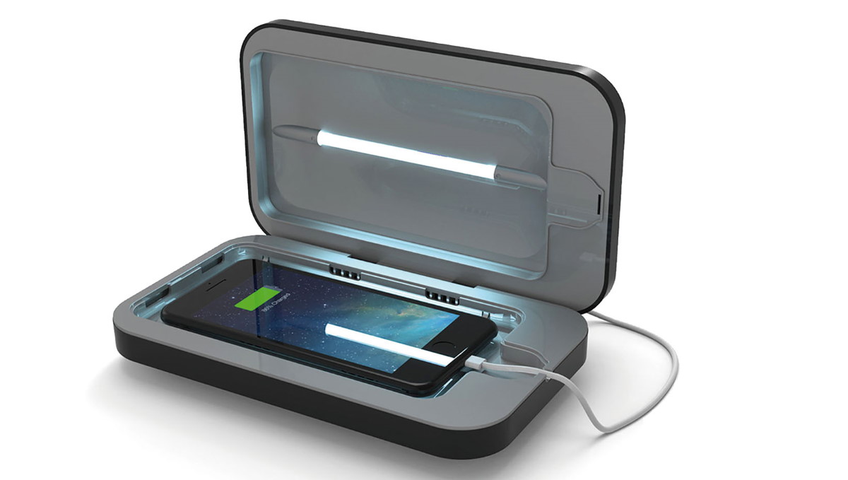 スマホ専用の除菌装置。スマホを中に入れるだけで除菌される。USB端子も装備しており、除菌中にスマホを充電できる。クリーニング液を利用した除菌に比べて、スマホの外装にダメージを与える可能性が少ないのもメリット。