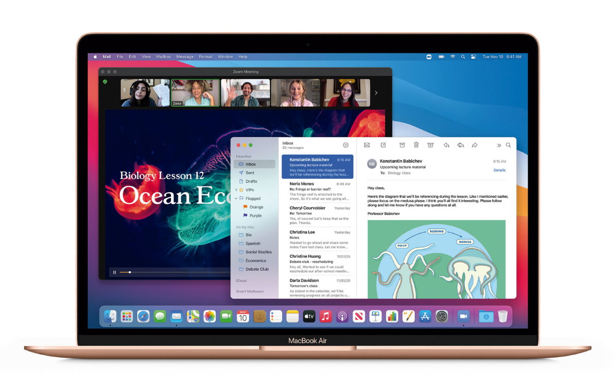 最新のmacOS「Big Sur」に対応。旧製品に対し、CPUは最大3.5倍、グラフィックスは最大5倍、機械学習は最大9倍高速化している。バッテリー駆動時間も6時間延びて最大18時間を実現。ファンレス仕様なので雑音が発生しないのも美点だ。