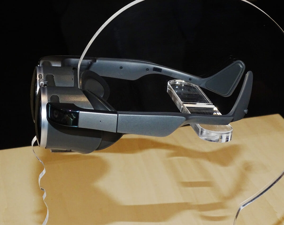 新しい試作機はディスプレイに映像が映せない試作機だったため、残念ながら“かけ心地”を確かめることしかできませんでした。筆者も装着してみたところ、昨年の試作機のように重心が前のめりにならず、快適に身に着けられました。装着感がアップした理由を開発担当者に聞いたところ、テンプル(つる)の形状を見直して先端にヒレのような膨らみを設けて、耳の後ろにしっかりとグリップする構造としたことがバランス改善に貢献しているようです。設計を見直す段階では眼鏡メーカーに協力を仰ぎノウハウを採り入れてきたとのこと。