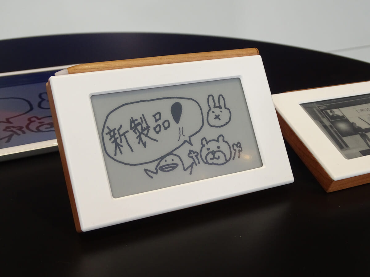 ディスプレイにはE-Ink方式の電子ペーパーを採用。本体に内蔵するバッテリーはフル充電の状態から約2か月間、画面を常時オンのまま使えるスタミナを実現しました。CroqyをWi-Fi経由でインターネットにつなぎ、無料で提供されるクラウドサーバーと常に同期しておけば、自動で画面を更新しながら家族からメッセージが届いたときに画面に表示してくれます。使い勝手はとてもシンプル。本体のフレームに天然木材を使ったデザインにも温かみが感じられました。