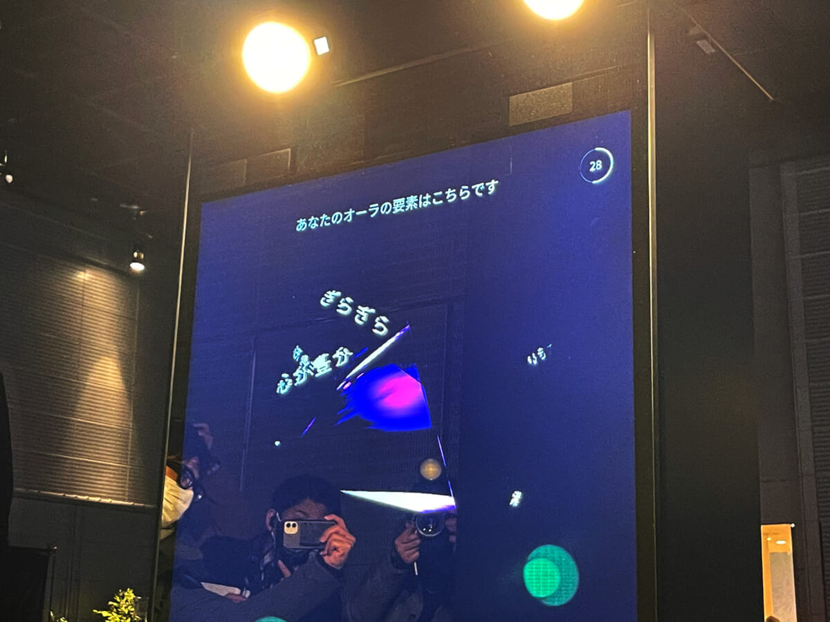 カメラの前に立ってからわずか20秒前後で解析が完了します。オーラの要素は色・形・質感を組み合わせた288通りのパターンで図形化され、また画面には同時に「ぎらぎら」「心が豊か」「器が大きい」など対象者の人となりを導き出したコメントを表示します。