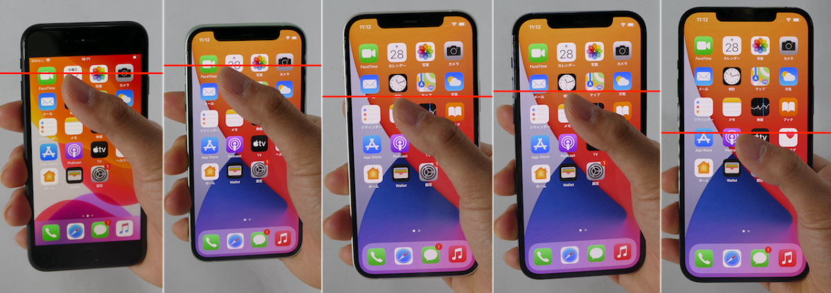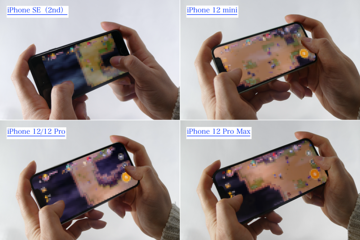 本体サイズに注目すると、最もコンパクトなのは「iPhone 12 mini」です。ホームボタンのある「iPhone SE」よりも小さく、筆者は片手で握った状態で、画面の対角線上もタッチ操作が行えました。