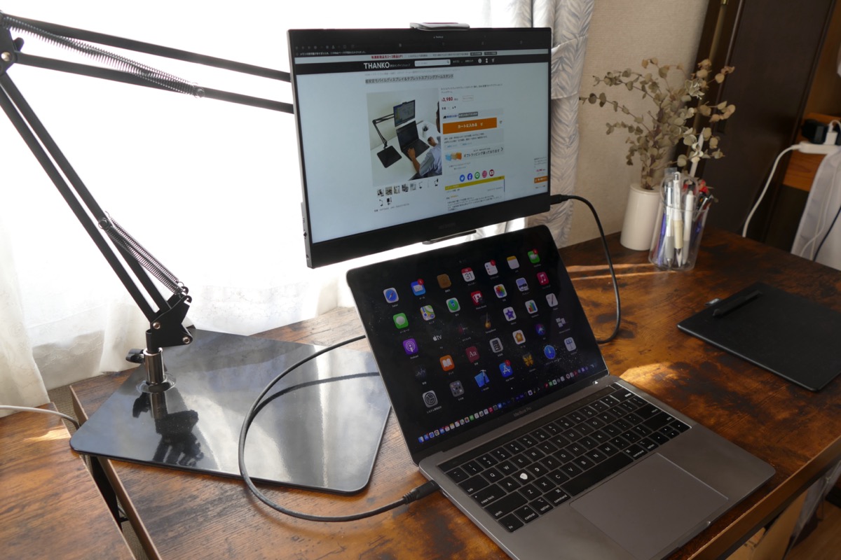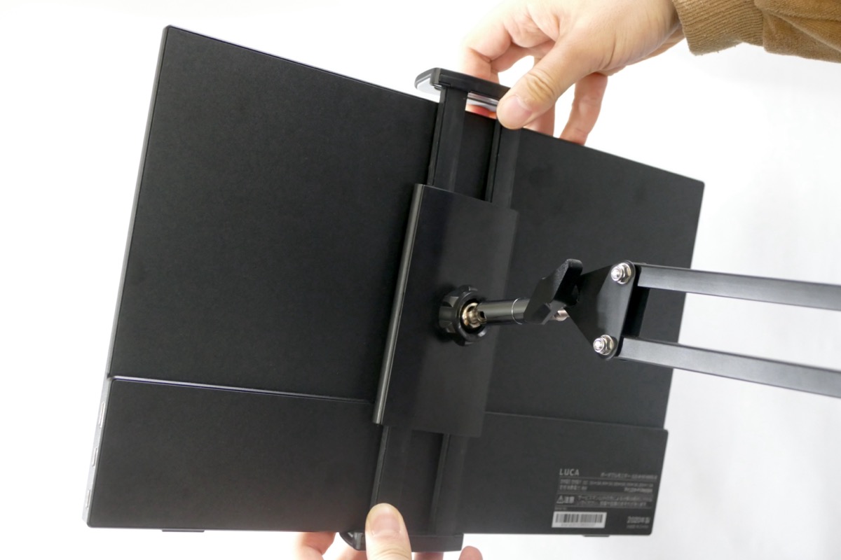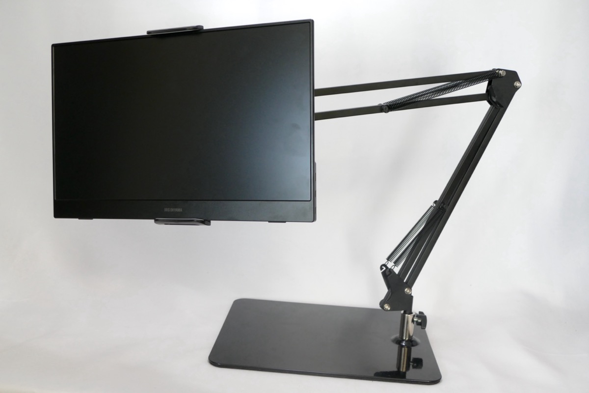 固定できるディスプレイは、15.6インチまで、耐荷重は700gまでとなっており、 一般的な外付けモニターをつけるにはやや頼りない。しかし、モバイルディスプレイ用iPadシリーズなどのタブレットを固定するには十分な仕様だ。筆者は主に、アイリスオーヤマ製の15.6型ポータブルモニター「ILD-A1616MS-B」をこれに固定して使っている。また、iPadでMacBookの「Sidecar」機能を使うような場面でも便利だ。