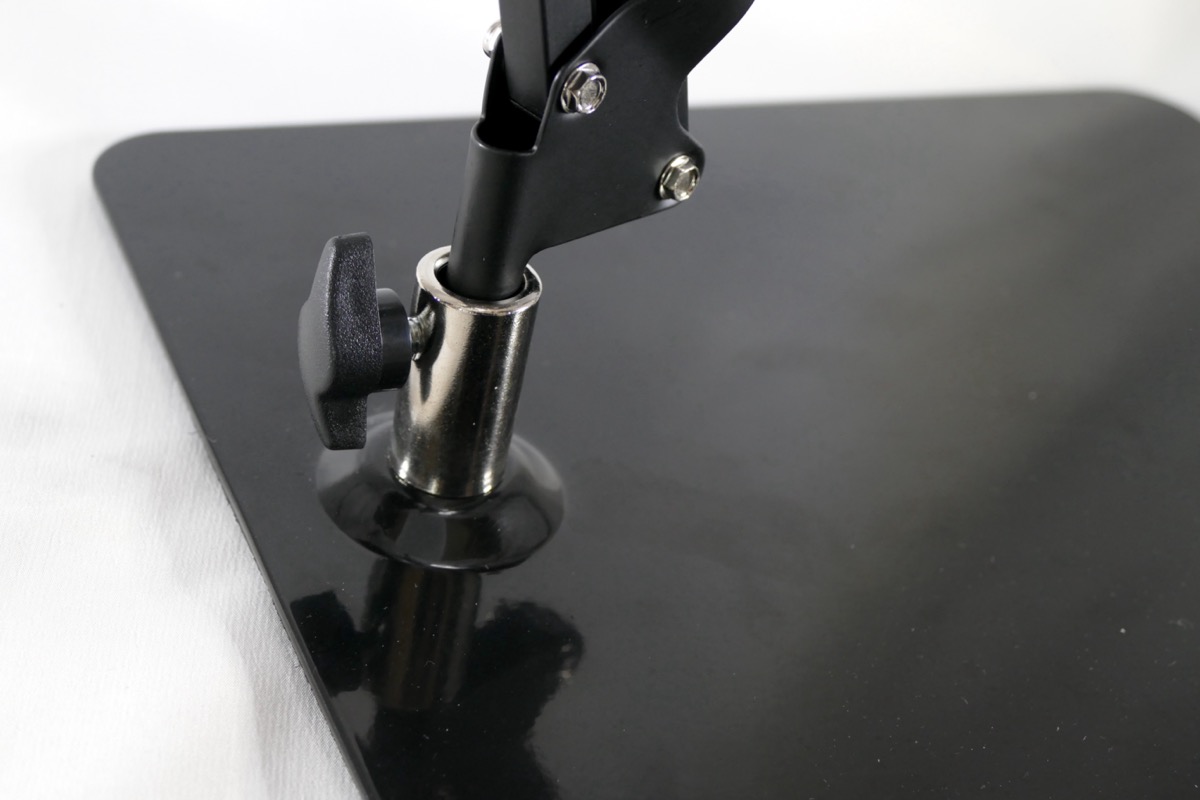 同製品の特徴は、”机に固定せずに使える”モニターアームであることだ。万力のように机を挟んでネジをぐりぐりと締め上げる必要がないぶん、ダイニングテーブルや床など、どこにでも設置できる。まぁ、机にA4用紙くらいのサイズ感がある底板部分がどっしりと存在感を放っている点は気になるが、ひょいっと持ち上げてすぐに片付けられるので、非常に取り回しがよい。