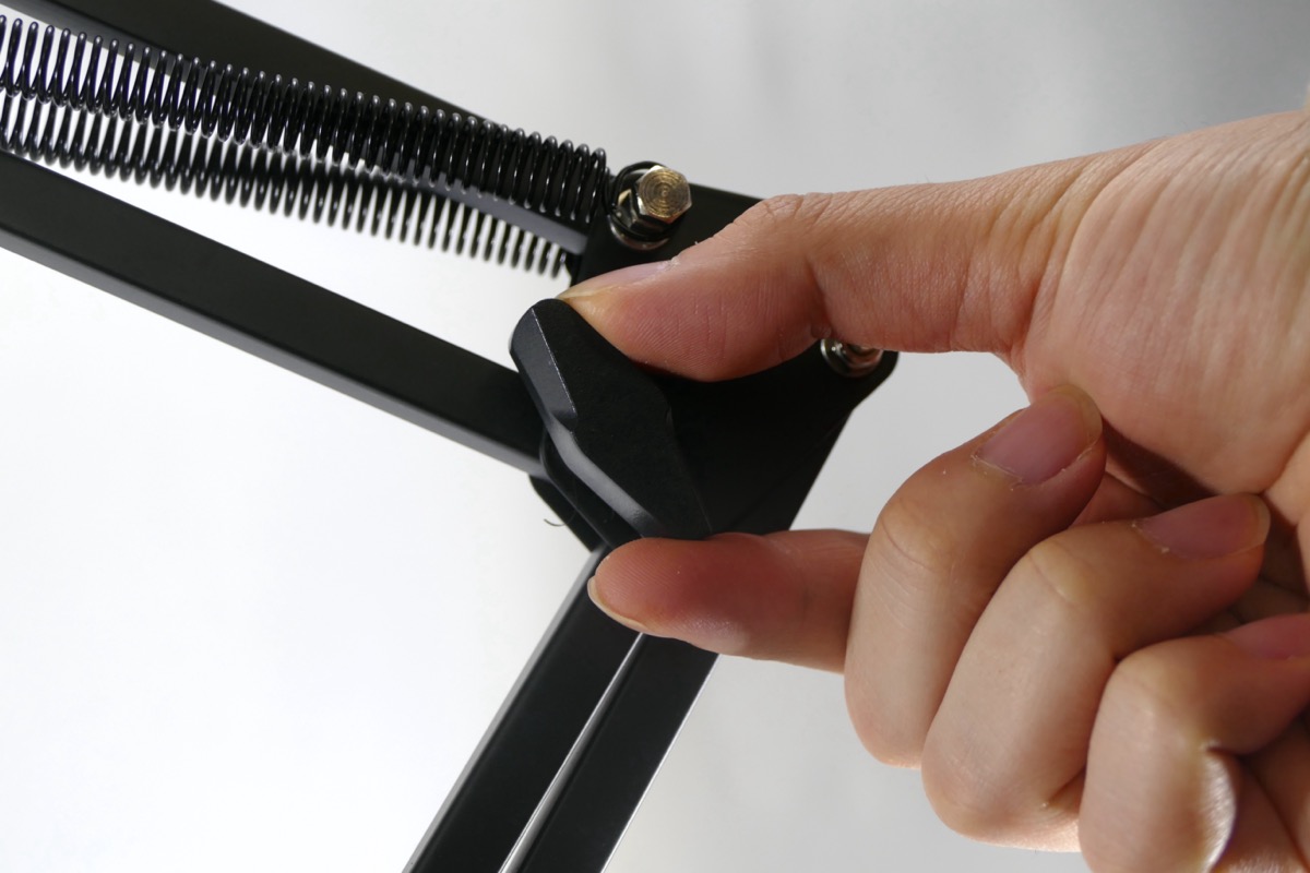 「超安定モバイルディスプレイ&タブレットスプリングアームスタンド」の組み立て方はシンプルで、工具も必要としない。底板にアームを差し込み、ネジで固定する。アームの角度もネジで固定できる。ホルダー部分は、タブレット用とスマホ用の2サイズが同梱されているので、モバイルディスプレイを装着する場合には、前者を選択しよう。