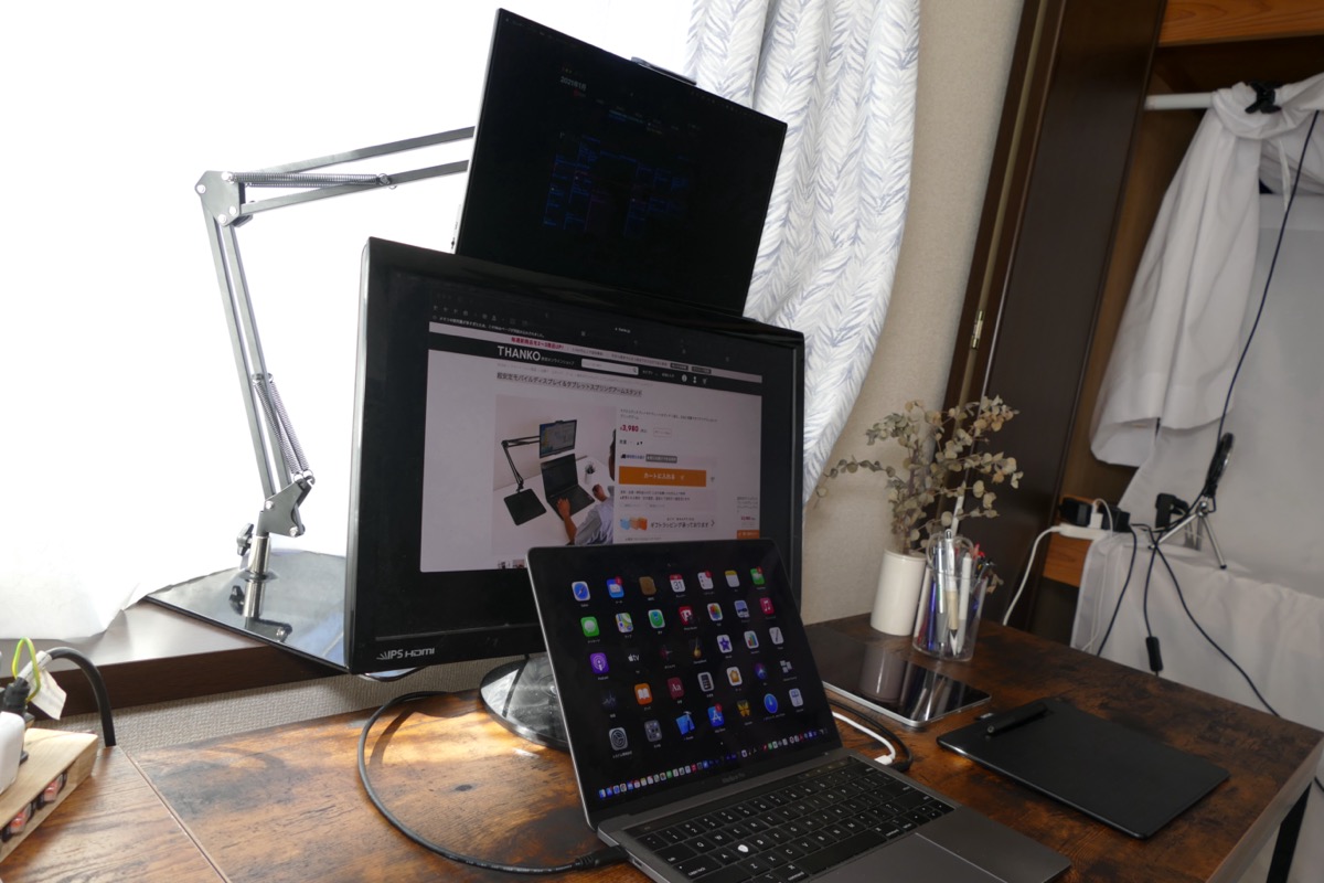 モバイルディスプレイやiPadでマルチディスプレイ化を試みてはみたものの、横並びではどうしてもしっくりこなかったという人はぜひこうしたアームで縦並びに挑戦してみて欲しい。なお、底板を含め、重さはそこそこあるので、小さなお子さんやペットなどがいる家庭では、転倒させないように気を配る必要はあるだろうが、配線などをうまく工夫すれば安全に使えると思う。