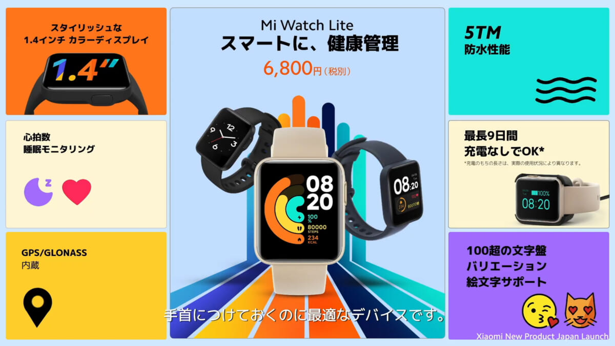 「Mi Watch Lite」は6800円と手ごろな価格のスマートウォッチ。角型の1.4インチ液晶ディスプレイを装備します。GPSや心拍モニタリング、睡眠計測に5気圧防水など、スマートウォッチとしての基本機能はしっかり抑えています。