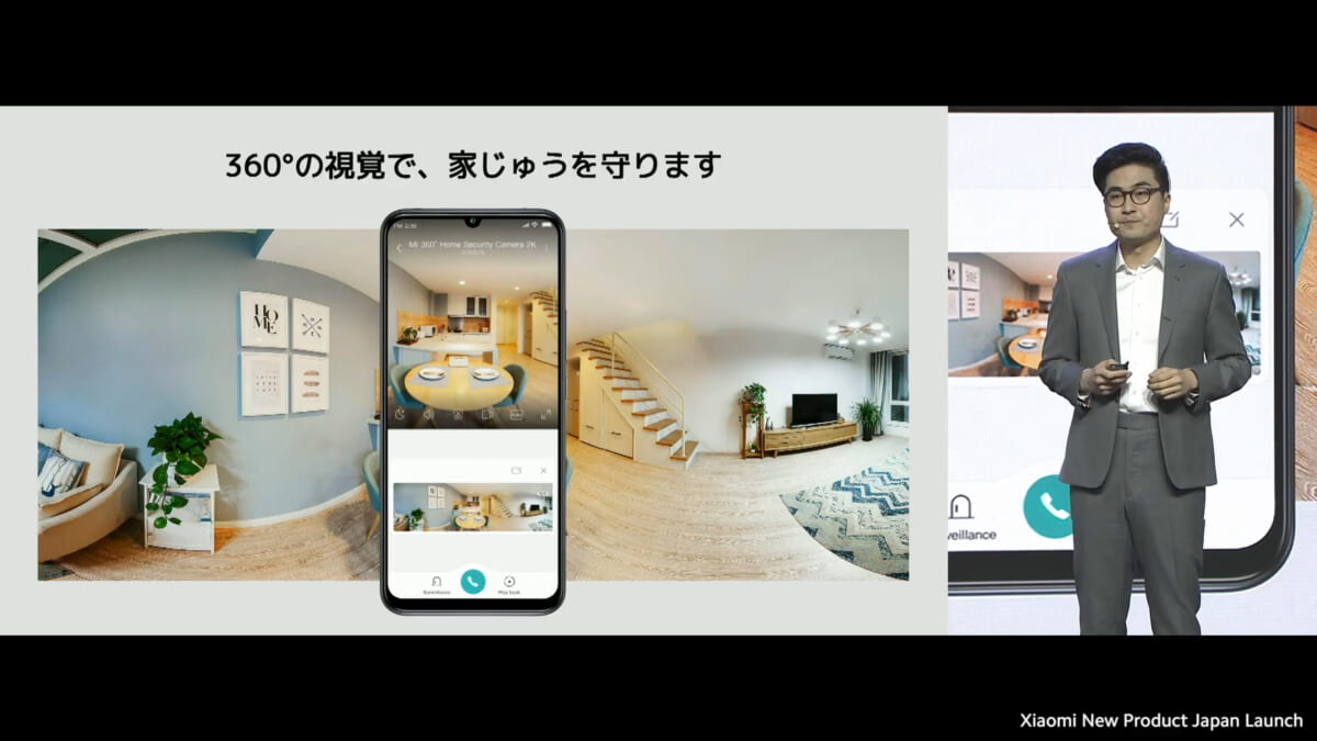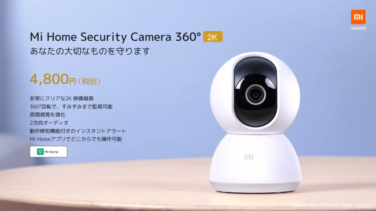 家庭用スマートカメラの「Mi 360°家庭用スマートカメラ2K」は4800円で販売。スマホと連携し、家の中の防犯や、子供やペットの様子の見守りに使える製品です。