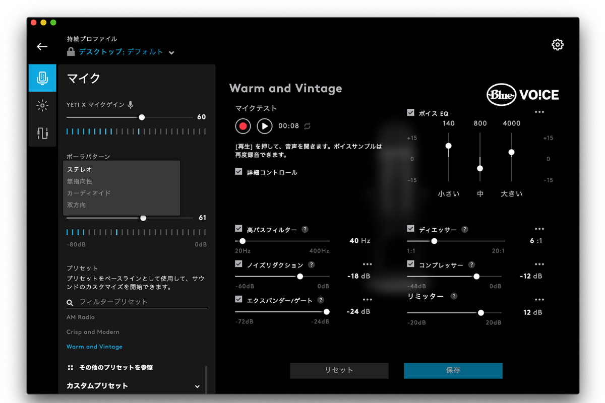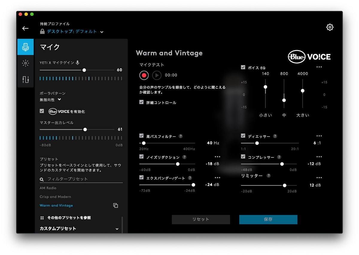 アプリケーションにはBlue Microphonesが開発した「Blue VO!CE」機能があります。これを有効にすると複数のプリセットが用意されているフィルターをかけて好みの音質を選べるほか、それぞれのフィルターをベースにユーザーカスタムの設定を保存して、新しいプリセットとして繰り返し使用可能。マイクの音に広がりを付けたり、あえてAMラジオっぽい聞こえ方にしてくれるフィルターなどもあり、色々と試すだけでも楽しめます。また、Yeti Xのユーザーが作成したフィルターをアプリケーション経由で共有できる機能もあります。