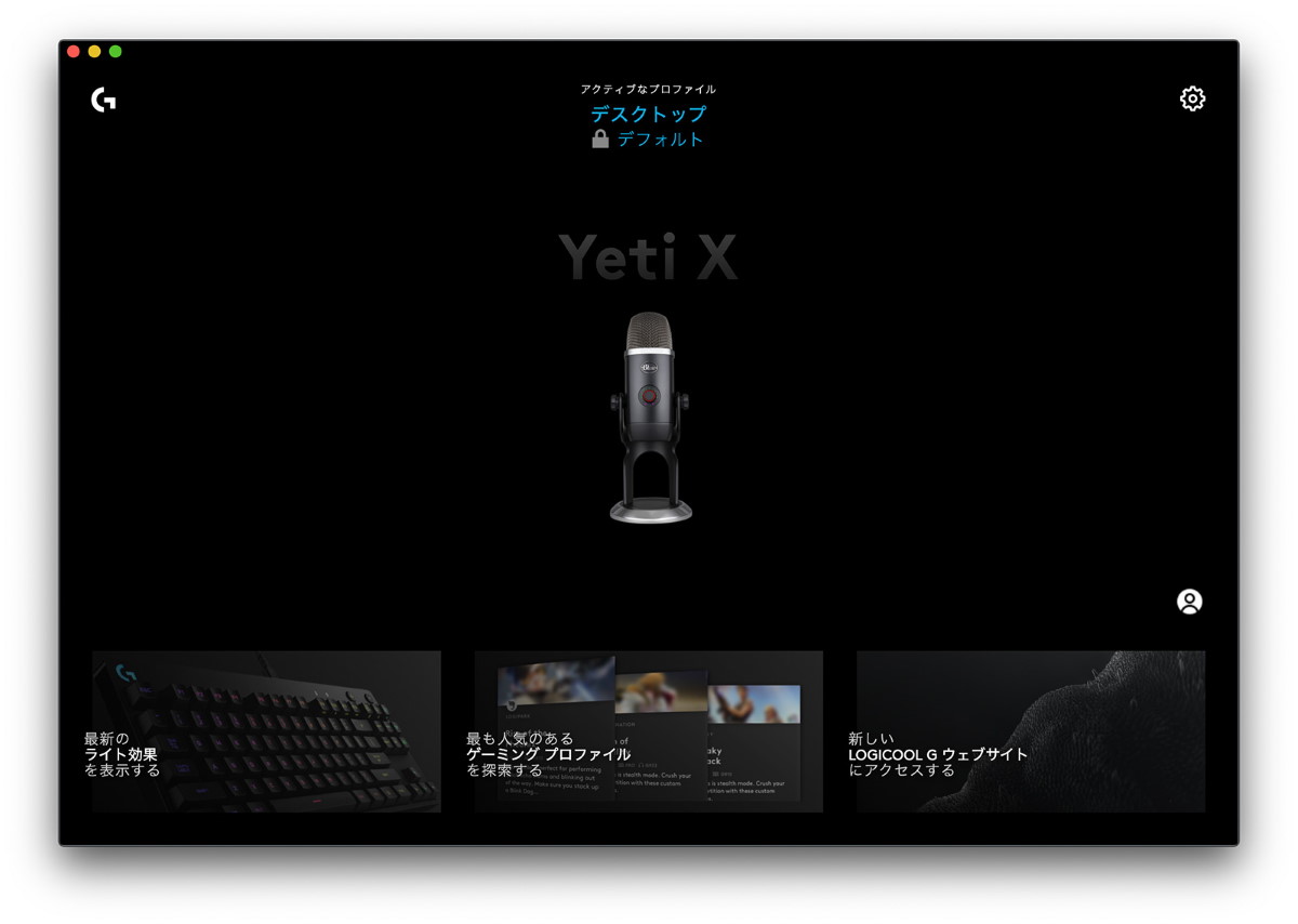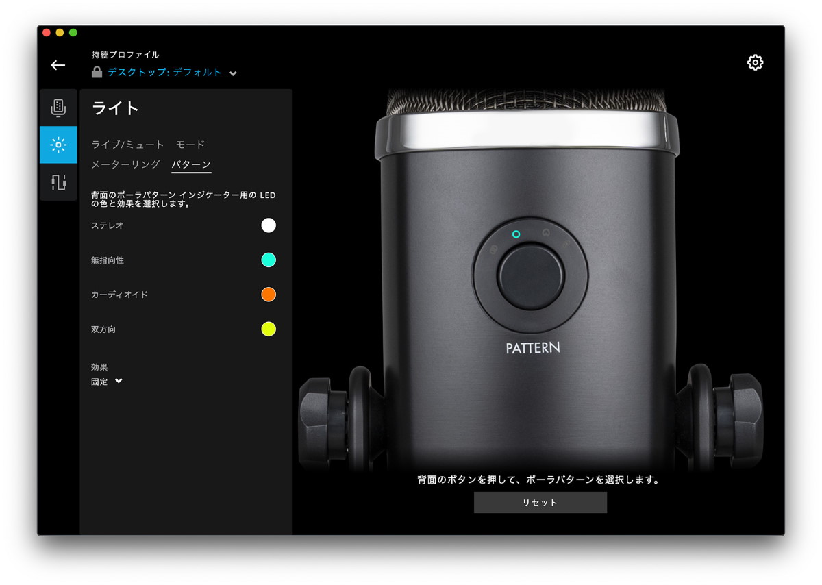 Yeti Xのマイク/ヘッドホン端子の音量、4つのピックアップパターンは本体のボタンですべての操作がまかなえます。これに加えてPCに「Logicool G Hub」アプリケーション(Mac/Windows対応)をインストールすると、マイクの音質や各スイッチにあるインジケーターLEDの発光色などを細かくカスタマイゼーションして楽しめます。