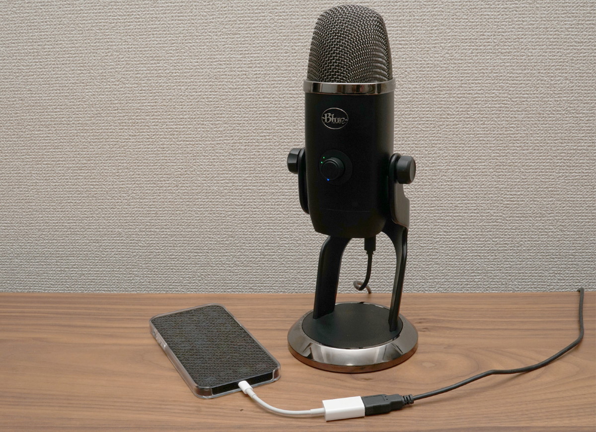 例えばiPhone 12に接続して使う場合は、Yeti Xとの間にUSBケーブルのほか、アップル純正の変換アダプタを介してつなぎます。Lightning端子を搭載するiPhoneやiPad、iPad miniの場合は「Lightning – USBカメラアダプター」、第四世代のiPad Airや最新のiPad Proなら「USB-C – USBアダプター」が対応しています。サードパーティの変換アダプタにも使えるものがありそうですが、筆者が持っているもので試したところ正しく動作しない製品がありました。万全を期すのであればアップル純正品がおすすめです。