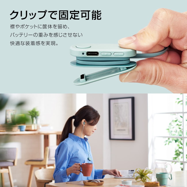 コードを筐体に巻きつけることができるため絡まりにくく、コンパクトに収納することが可能。また、筐体にコードを巻きつけることで左右のコード長さを調節して使用することができます。クリップを搭載しており、衣服のポケットや襟に留めれば快適に装着できます。