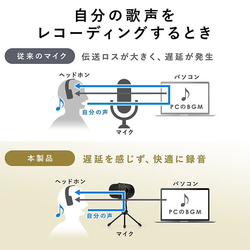 マイク背面には音声出力端子を備え、ヘッドホンやスピーカーを接続可能。パソコンを介さずマイクの音を出力できるダイレクトモニタリングに対応しています。