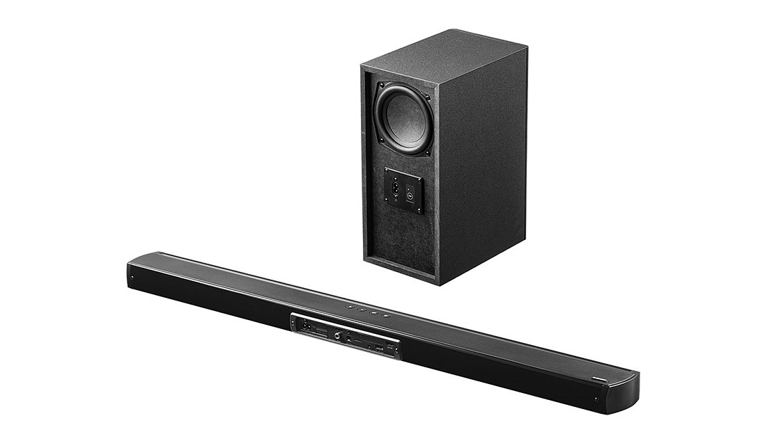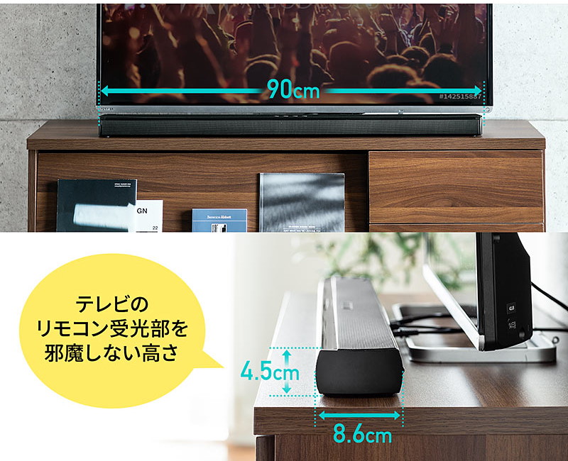 本品は、低域から高域まで再生するスリムデザインのサウンドバーと、低域を増強するワイヤレス接続のサブウーファーをセットにしたもの。サウンドバーはテレビの前に置きやすい高さ45mmの薄型仕様で、赤外線リモコンの受光部の邪魔になりにくくなっています。また、サブウーファーはサウンドバーとワイヤレス通信を行うので設置の自由性が高く、テレビの横やソファの近くなど視聴環境に応じて置き場所を選べます。