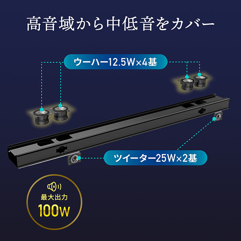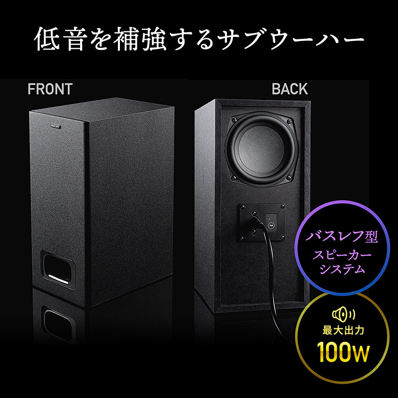 サウンドバー部には高音域用ツイーター2基と中低音再生用のウーファー4基を搭載。サウンドバーは実用最大出力100W(ウーファー部/12.5W×4、ツイーター部/25W×2)、サブウーファーも実用最大出力100Wの合計200Wの高出力を実現しており、パワフルなサウンドを再生します。
