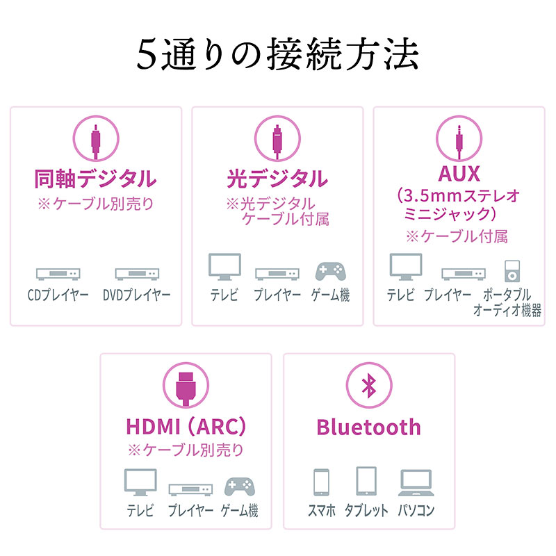 接続は光デジタルとAUX(ステレオミニ)に加え、別売のケーブルを用意すればHDMIや同軸デジタルにも対応。Bluetooth接続にも対応しており、スマホやタブレットの音声をワイヤレス再生することも可能です。