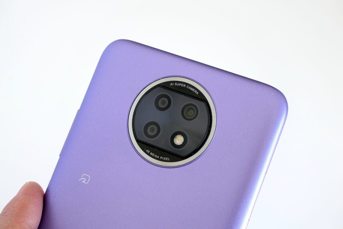 背面パネルはポリカーボネート製で、指紋が付着しにくい表面処理が施されています。円形で搭載されたトリプルカメラはメイン(4800万画素)+マクロ(200万画素)+深度センサー(200万画素)という構成。AIによるシーン認識に対応し、暗い場所でも鮮明な画質で撮影できます。超広角が撮れないという弱点はありますが、むしろ「この価格でここまで撮れるのか」と驚くこと請け合いです。