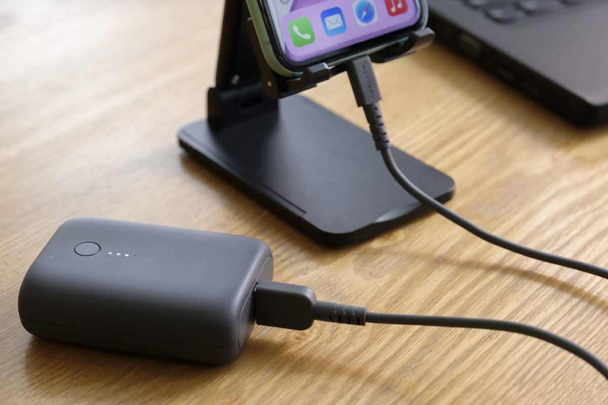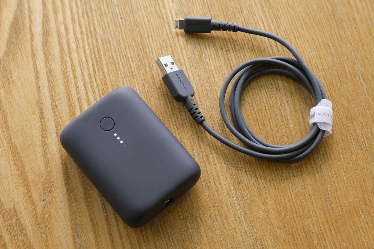 このコンパクトなスタンドと一緒に持ち歩きたいのが、国内最小最軽量(※)のモバイルバッテリー「MOT-MB10001」(直販価格2899円)です。こちらは、iPhone 11/12なら2回フル充電できる10000mAhの大容量なのに、本体はICカードよりも小さい超コンパクトサイズ。さらに、わずか174gという驚異的な軽さで、持ち歩きが苦になりません。