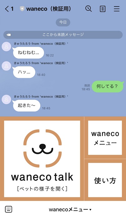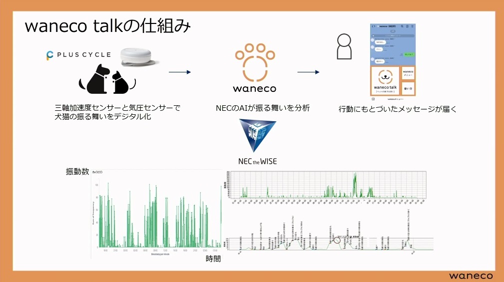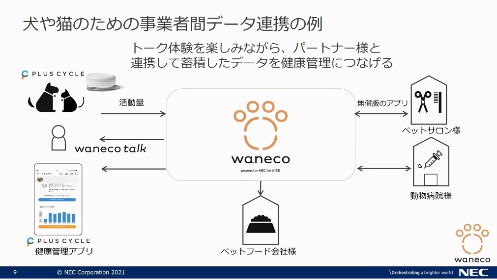 また、日本動物高度医療センター(JARMeC)が販売する犬猫用活動量計「PLUS CYCLE」を用い、収集した犬猫の行動を、NECの最先端AI技術群「NEC the WISE」により分析。これに基づいたペットの状態をLINEメッセージで確認できる「waneco talk」も提供されます。