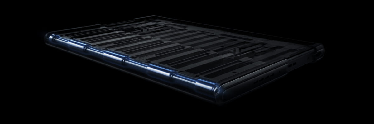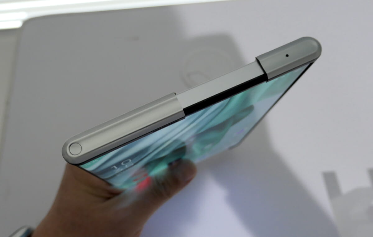 筆者も実際に操作させてもらいました。まるで魔法のように、なめらかに画面が伸縮します。本体の左端に6.8mm幅の中心軸が内蔵されていて、そこをカーブしてディスプレイが巻き取られる仕組み。内部には左右から噛み合わさる仕組みの2 in 1プレートを内蔵し、2つのモーターが均等に動いて、安定した開閉操作を実現しているとのこと。スマホの内部構造ではバッテリーが大きなスペースを閉めますが、バッテリーのカバーも左右に分かれて広がる仕組みになっているそうです。