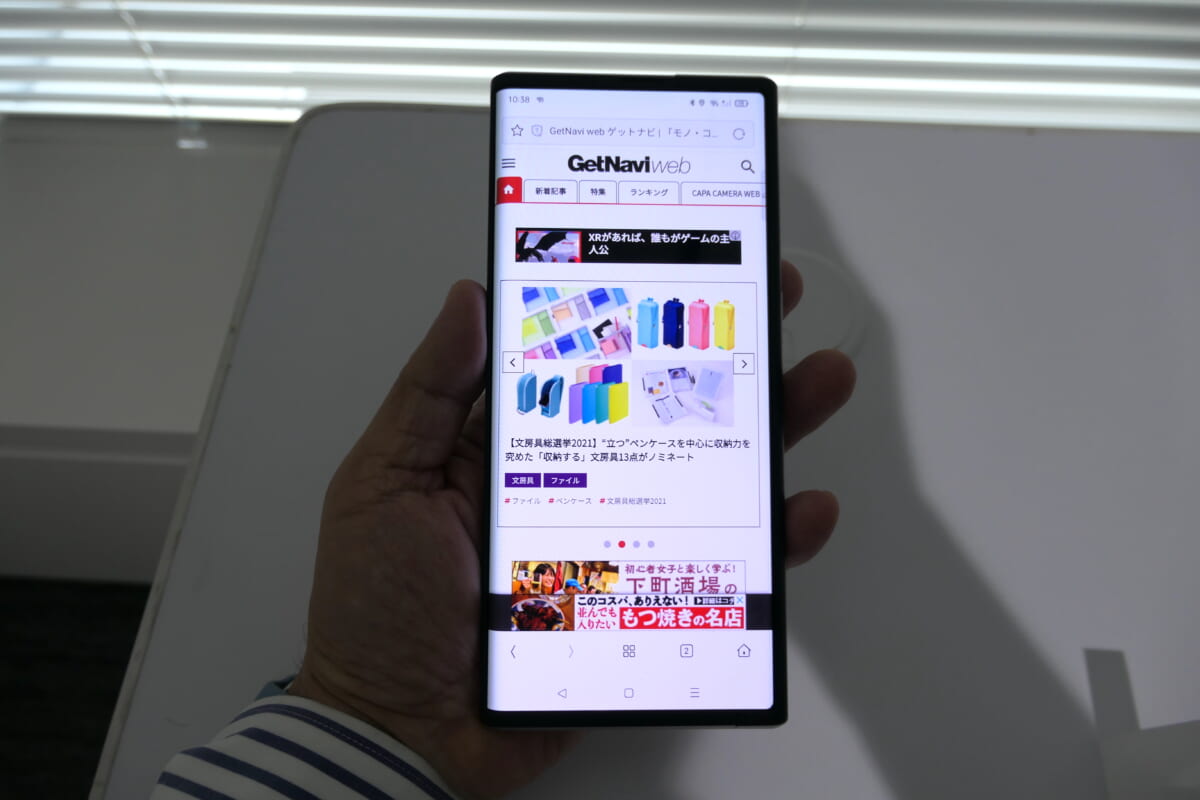 通常は6.7インチの大画面スマホで、サイドキーを長押ししたり、なぞったりすると、画面がゆっくり伸びて7.4インチに。もちろん、ディスプレイがゴムのように伸びるわけではなく、巻き取り式のディスプレイを搭載し、画面を広く使いたい時にだけ、画面を引き出せる仕組みです。