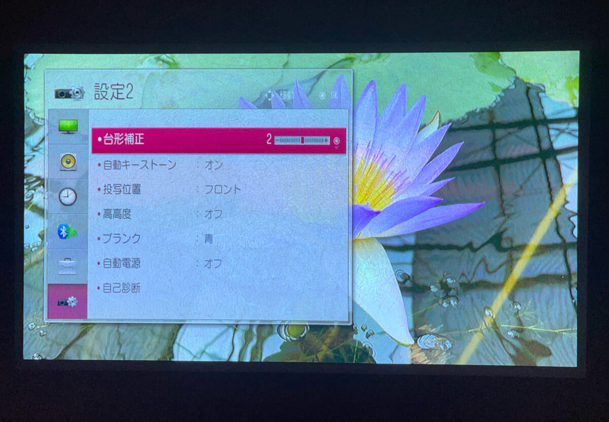 もうひとつは、設置方法の自由度を高めてくれる垂直方向の「自動台形補正機能」が付いていることです。低めのテーブルに本機を置いて、少し角度を付けた状態で壁に映像を投写しても画面の台形歪みを自動的に直してくれます。ただし水平方向には手動による歪み補正にも対応していないため、プロジェクターは常に幕面の真正面に置く必要あり。