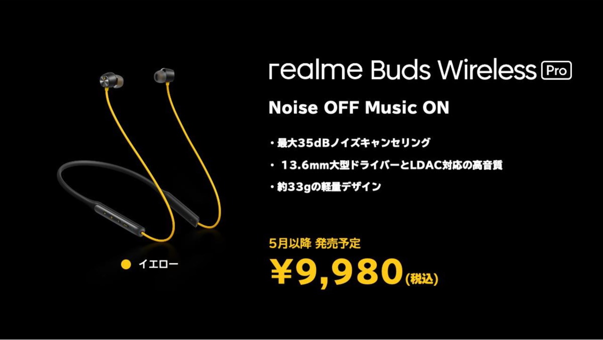 Realmeのブランドカラーでデザインされたネックバンド型のワイヤレスイヤホン。13.6mmのダイナミックドライバーを搭載し、高音質なLDACコーデックに対応。さらに最大35dBのノイズキャンセリング機能も備えています。5月以降発売予定で、価格は9980円。
