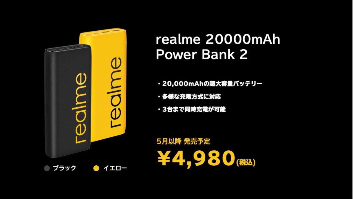 20000mAhの大容量モバイルバッテリー。USB Type-Aが2口、Type-Cが1口の計3ポートを搭載し、最大3つのデバイスを同時に充電可能です。色はイエローとブラックから選べます。5月以降発売予定で、価格は4980円。