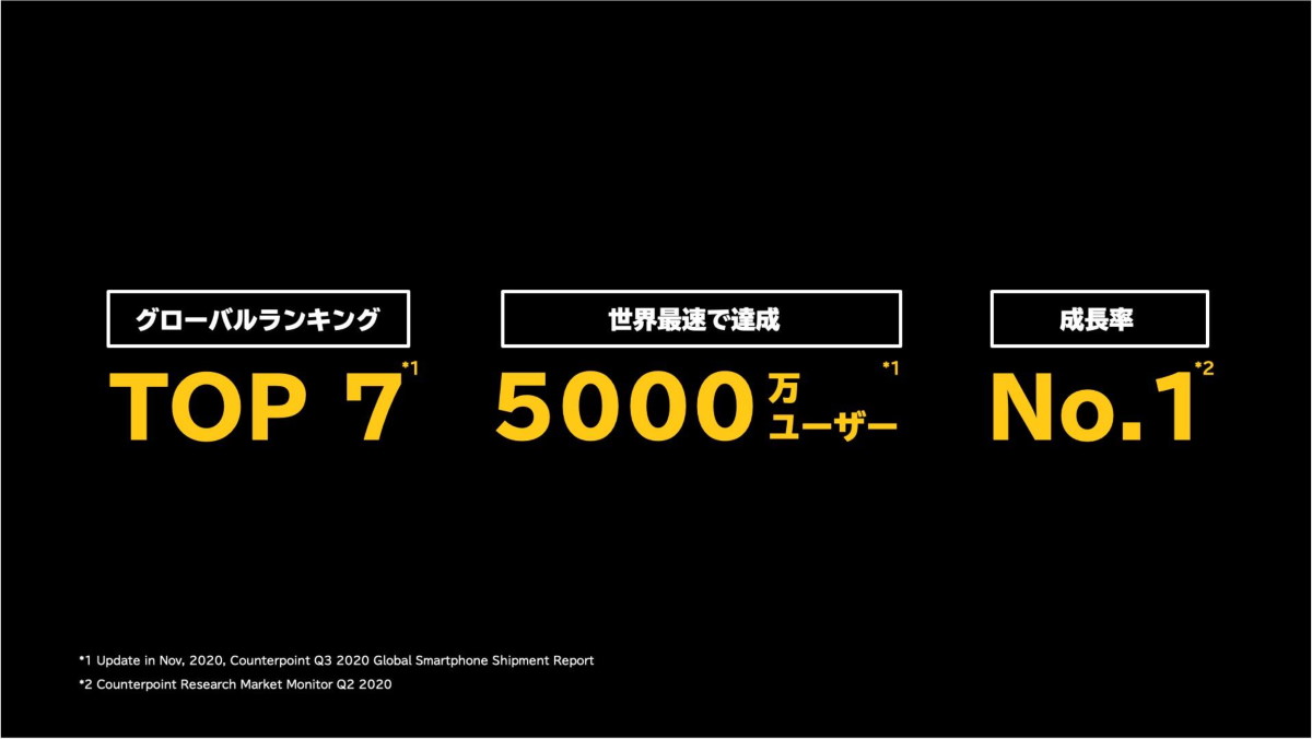設立以来、常に「過去を超え続けること」をブランドのDNAとして、主に若い世代に訴求する製品を展開。2019年からグローバル展開を開始し、2020年の初めに「スマートフォン+IoT」という戦略的エコシステムを発表。2020年11月には、世界で5000万台のスマホ販売を達成。設立からまだ3年も経っていませんが、スマホの出荷台数では世界第7位(2020年第3四半期)になるほど急速な躍進を遂げています。