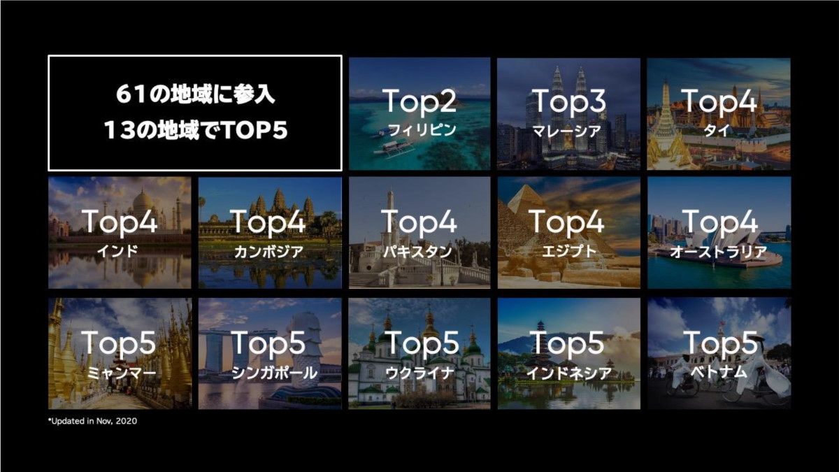 これまでに61の国と地域に参入し、そのうち13地域では、スマホシェアのトップ5に入っているとのこと。例えば、フィリピンでは2位、マレーシアでは3位を獲得しています。