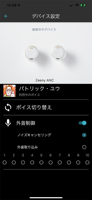今回はネインの最新完全ワイヤレスイヤホン「Zeeny ANC」を借りて、Zeenyの音声アシスタント機能を試しました。ネインの山本氏が「開発時にとりわけ注力した」というアクティブ・ノイズキャンセリング機能の効果はとても高く、しかも音楽再生のバランスを崩さない自然な消音感を特徴としています。地下鉄の甲高いブレーキ音から、バスや自動車の低いエンジン音まで様々な種類のノイズが自然に消える感覚は見事。Zeenyアシスタントアプリでは外音取り込み機能のレベルを10段階から細かく選択できます。