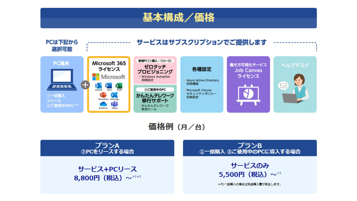 マイクロソフトのクラウド『Microsoft Azure』をベースにテレワーク環境を構築するサービスで、クラウド環境の初期構築やパソコンの初期設定、運用後のサポートにまで対応。Officeアプリケーションや『Microsoft Teams』など、ビジネスシーンで役立つツールも利用可能で、テレワーク環境に必要な要素が用意されている。