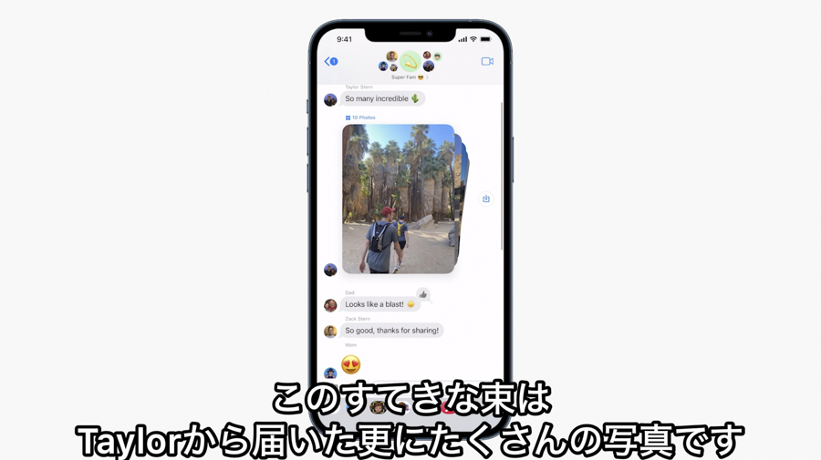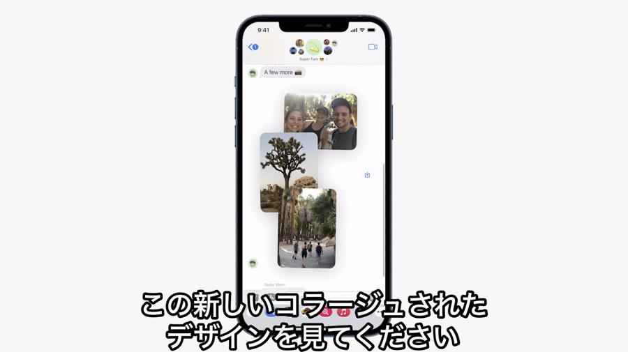 Messageアプリもシェア機能を中心に強化されています。これまでMessageで複数の写真を送ったときにはタイムライン上に画像が1枚ずつ表示されていましたが、新たに複数の写真をコラージュして見やすく表示できるようになるほか、たくさんの画像をまとめて1枚だけタイムライン上に表示し、タッチするとアルバム画面が開くような動作が可能となっています。