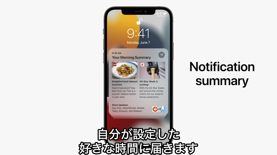 iOS 15では、仕事に集中したりプライベートな時間を確保するために、通知機能をカスタマイズする機能が追加されました。朝や夕方など決まった時間に通知をまとめてお知らせする「サマリー」機能や、あらかじめ設定したアプリからの通知のみ表示させる「集中モード」を使えば、余計な通知に邪魔されずに時間を有意義に使うことができるようになります。