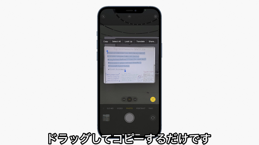 画像上のテキストを認識する機能も強化されました。ノートやホワイトボードに書いた文字を撮影すると、画像上の文字をテキストとして認識し、ほかのアプリにドラッグ&ドロップしたりコピペしたりすることが可能となります。これは自分で撮影した画像だけでなく、web上の画像などでも利用可能。写真に写った電話番号をタップし、そのまま電話することもできます。