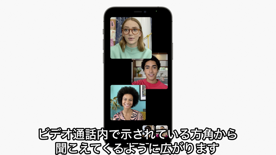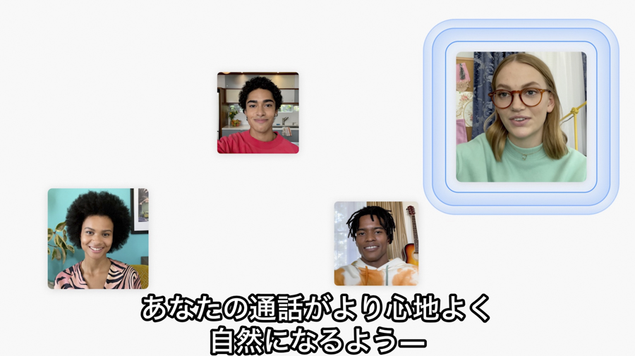 コロナ禍でオンラインコミュニケーションの機会が増えたことを受け、ビデオ通話アプリ「FaceTime」の機能が大幅に強化されました。まず、アップルが推進する空間オーディオに対応し、画面上に表示された方向から話者の音声が聞こえるなどより自然な通話ができるように改善されるとともに、周囲の雑音を低減して話者の声だけにフォーカスすることが可能に。これはオンオフを切り替えられるので、周囲の音も届けたいときはオフにするなど、シーンに応じて使い分けることができます。また、カメラでおなじみのポートレートモード機能が利用できるようになり、背景をぼかして人物だけを際立たせられるようになります。