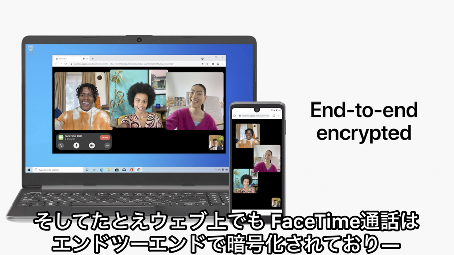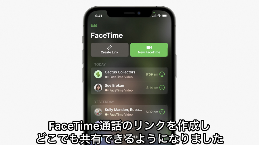 さらに、リンクからビデオ通話に参加できる「FaceTime Link」機能が追加され、リンクを送ることでAndroidやMac以外のPCからも参加できるようになります。リンクをカレンダーに登録しておけば、先々のビデオ通話の予約をすることも可能。FaceTimeをビデオ会議のツールとして利用しやすくなっています。