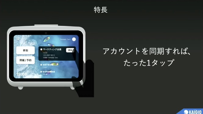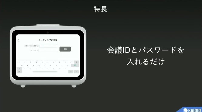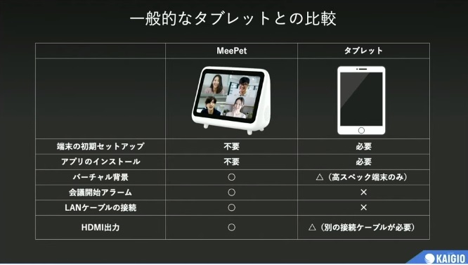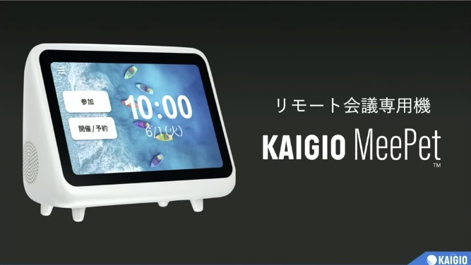 「KAIGIO MeePet」は、日本初のZoom SDKを利用したオールインワンのリモート会議専用機。ディスプレイを備えた本体に、カメラ・マイク・スピーカーを内蔵しているので別途用意する必要がなく、初期設定はWi-Fi、またはLANケーブルでネットに接続するだけで使えます。HDMI出力も備えており、大画面モニターやプロジェクターなどに出力することも可能です。