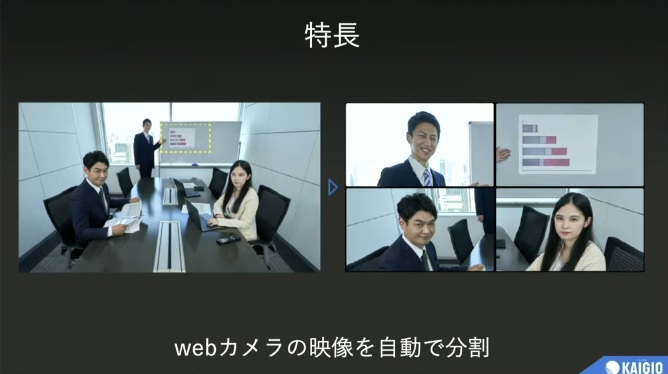 このほか、リモート会議に便利なPC用ソフト2種も登場。「満面KAIGIO」は、日本初のwebカメラ映像自動分割ソフト。AIによる顔認識テクノロジーでリモート会議の出席者をクローズアップし、最適な見え方にします。