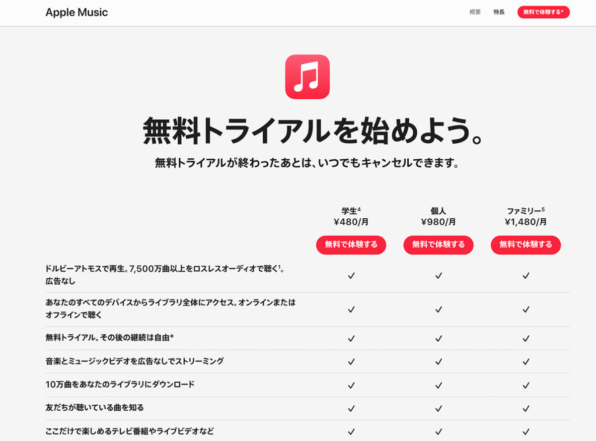 Apple Musicの利用料金には、1人のユーザーが1つのアカウントで使える月額980円(税込)の「個人プラン」と、登録したユーザーに加えて最大5人のユーザーアカウントを登録でき、同時にそれぞれのデバイスで再生できる月額1480円(税込)の「ファミリープラン」があります。また、学生のユーザー向けにはお得な月額480円(税込)の「学生プラン」が用意されています。