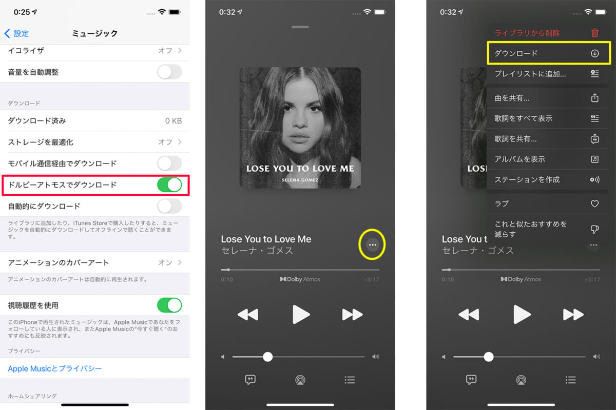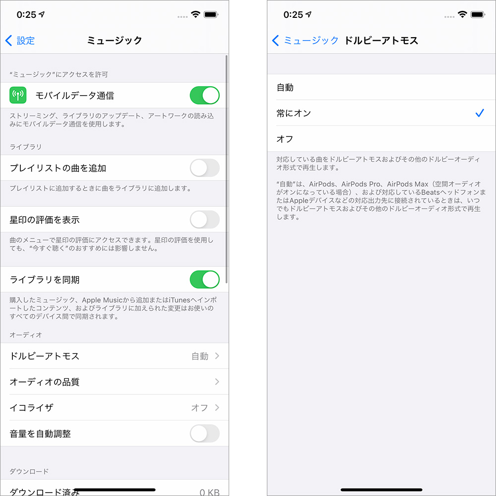 空間オーディオに対応する楽曲はApple Musicのほかの音楽コンテンツと同様、iPhoneのストレージ容量が許す限りデバイスに楽曲をダウンロードしてオフラインで聴くことができます。ミュージックアプリの「設定」から、「ダウンロード」の項目に並ぶ「ドルビーアトモスでダウンロード」の選択をオンにしましょう。これで外出先では、ギガの減りを気にすることなく、空間オーディオを楽しむことができます。