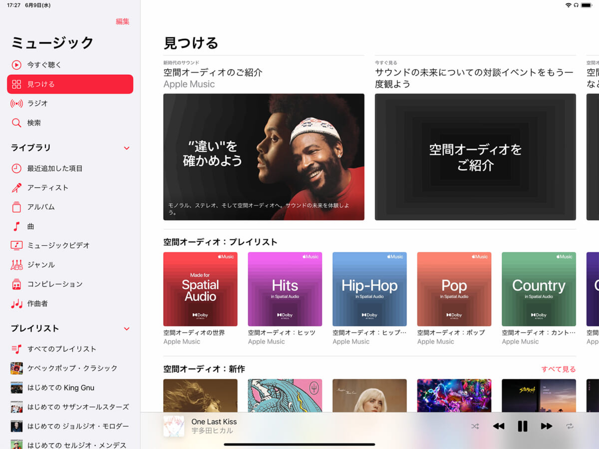 最もシンプルなのは、ミュージックアプリの「見つける」タブからいける、8種類の「空間オーディオ:プレイリスト」からたどる方法です。「検索」機能からドルビーアトモス、空間オーディオなどのキーワードを入れて検索もできるようにしてほしいところですが、筆者が本稿を書いている6月中旬時点ではまだ対応していません。