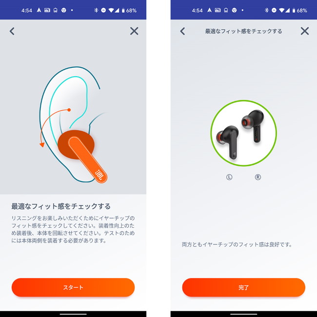パッケージにはサイズ・形状が異なる5種類のシリコンイヤーピースが付属します。フィット感を調節すると音の聞こえ方のバランスも変わるので、ベストなイヤーピースは慎重に選びたいものです。専用アプリに搭載する「最適なフィット感をチェックする」という機能により、選んだイヤーピースが自分の耳と適切にフィットしているものなのかが、わずか数秒間で測定できます。