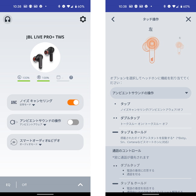 ANCとアンビエント機能の切り替えはアプリのホーム画面から行うか、または左右イヤホンのタッチセンサーリモコンで行います。リモコンの操作方法はアプリから自由に割り当てることができます。筆者はANCとアンビエントの切り替えをよく使うので、左イヤホンのシングルタップに設定しました。