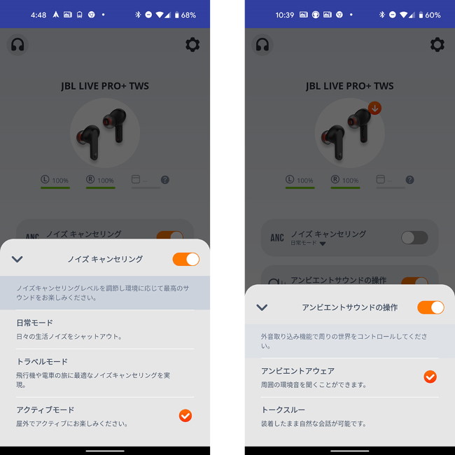 ノイズキャンセリングの強度はアプリから「日常」「トラベル」「アクティブ」の3段階を選んでスイッチできます。トラベルに切り換えると消音効果が強くなります。地下鉄や飛行機に乗るときにはトラベルモードが最適だと思います。アクティブと日常モードの強弱はさほど変わらないと感じました。むしろ屋外で歩きながら音楽を聴くときなどにはアンビエント機能を使うべきでしょう。