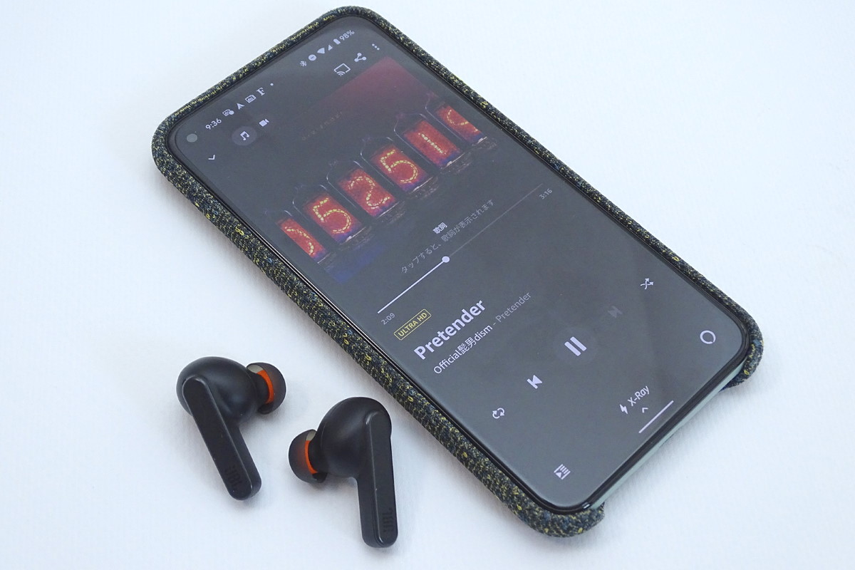 LIVE PRO+が対応するBluetoothオーディオのコーデックは、昨今では最も一般的なAACにSBCという構成です。Amazon Music HDからいくつかの楽曲を聴いてみました。ANCはオンで日常モードを選択しています。