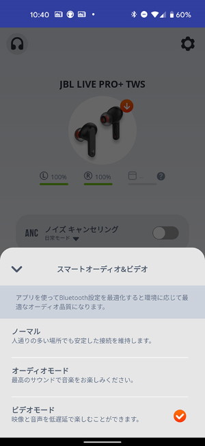 専用アプリのホーム画面にならぶ「スマートオーディオ&ビデオ」の中に、動画再生時の音声とのずれを解消する「ビデオモード」が搭載されています。YouTubeやその他の動画サービスを楽しむ際に、ビデオモードを選んでおけば口もとの動きに音声がピタリと合います。